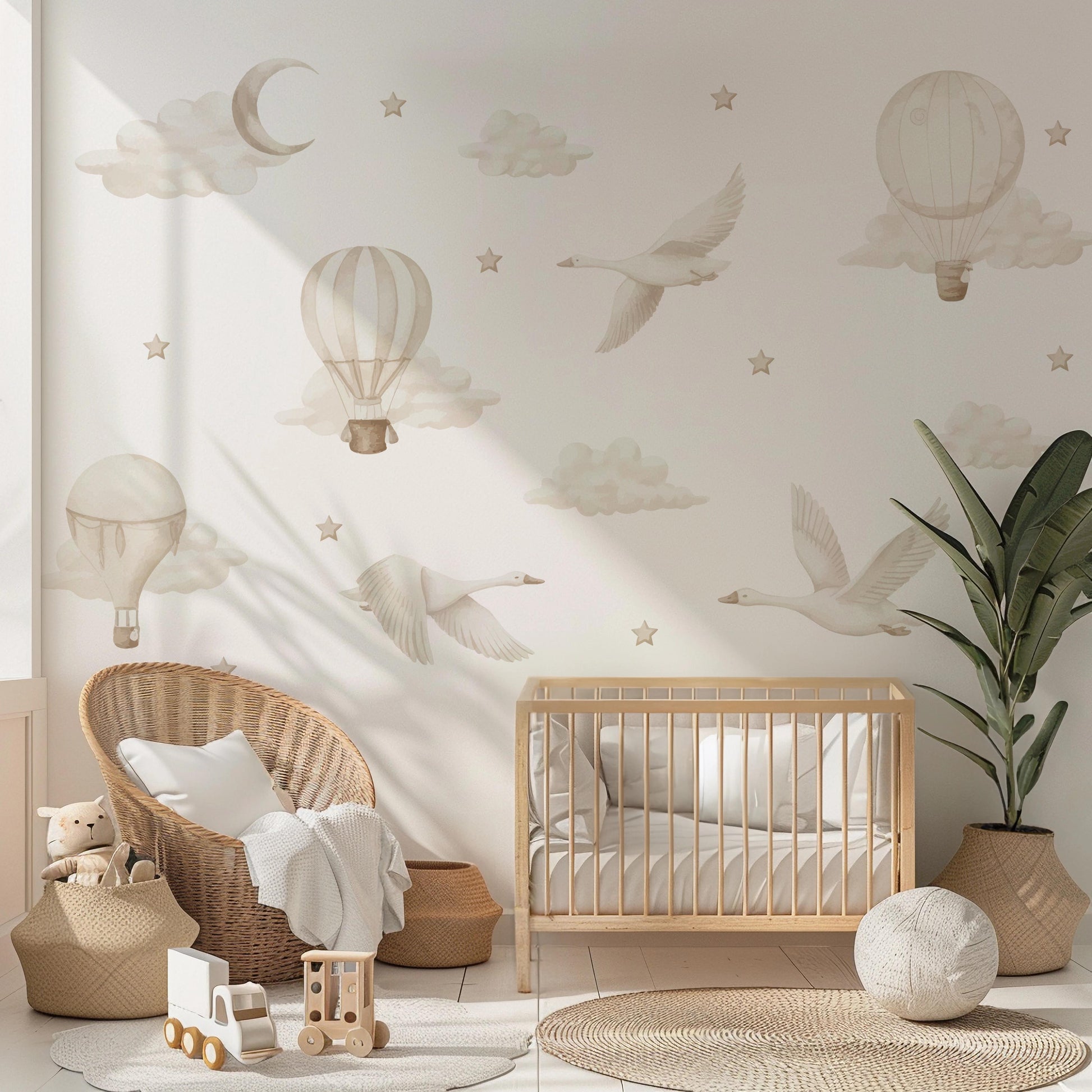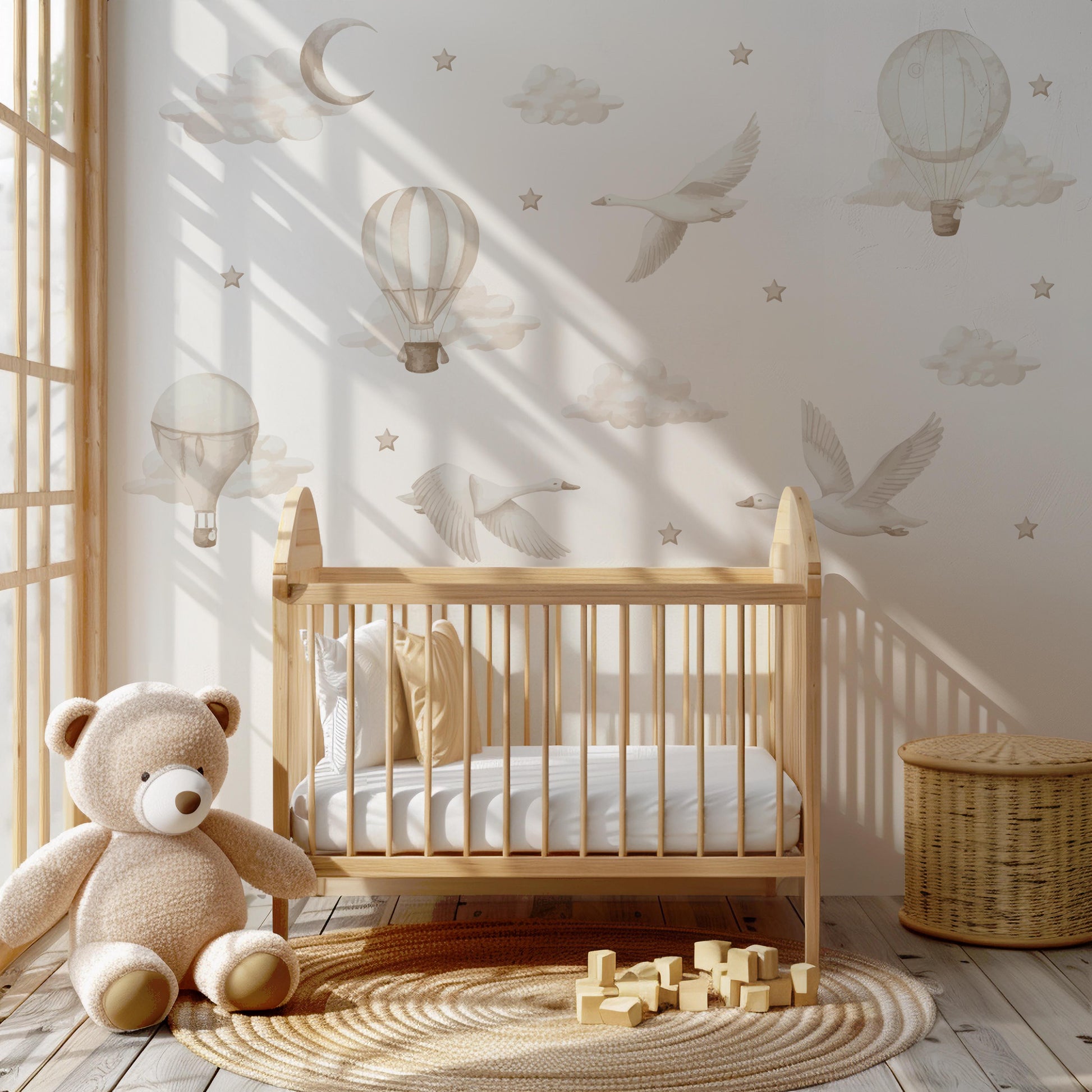 Let your little one’s imagination take flight with our Geese with Hot Air Balloons nursery wall decal set. This large, story-like design features graceful flying geese, floating hot air balloons, soft clouds, and delicate stars, all illustrated in gentle pastel and white tones.